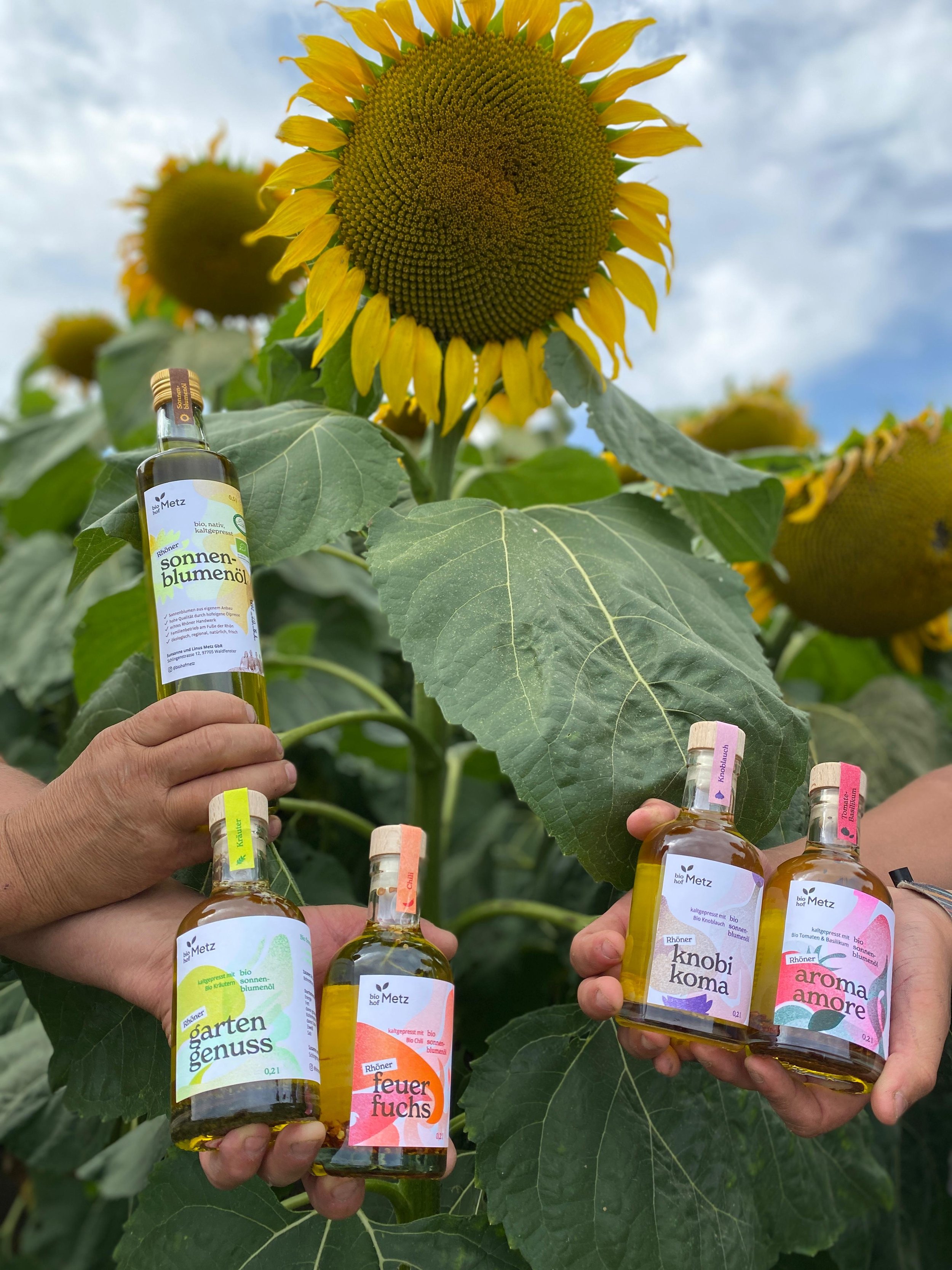 Mit unserer hofeigenen Presse produzieren wir Sonnenblumenöl aus unseren Bio-Sonnenblumen, die wir mit Hingabe und Sorgfalt selbst anbauen. Genießen Sie die natürliche Frische und den unvergleichlichen milden, nussigen Geschmack unseres Sonnenblumenöls, das direkt von der Sonne geküsst wurde.