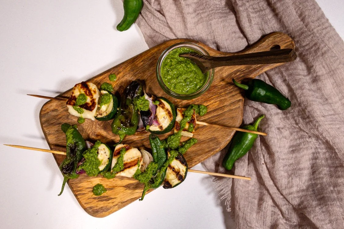 Für die Mojo Verde eine Knoblauchzehe schälen und hacken, Paprika grob würfeln und die Kräuter grob hacken. Alles zusammen mit dem Bio-Sonnenblumenöl und dem Weißweinessig mit dem Pürierstab mixen. Mit Salz und Pfeffer abschmecken.