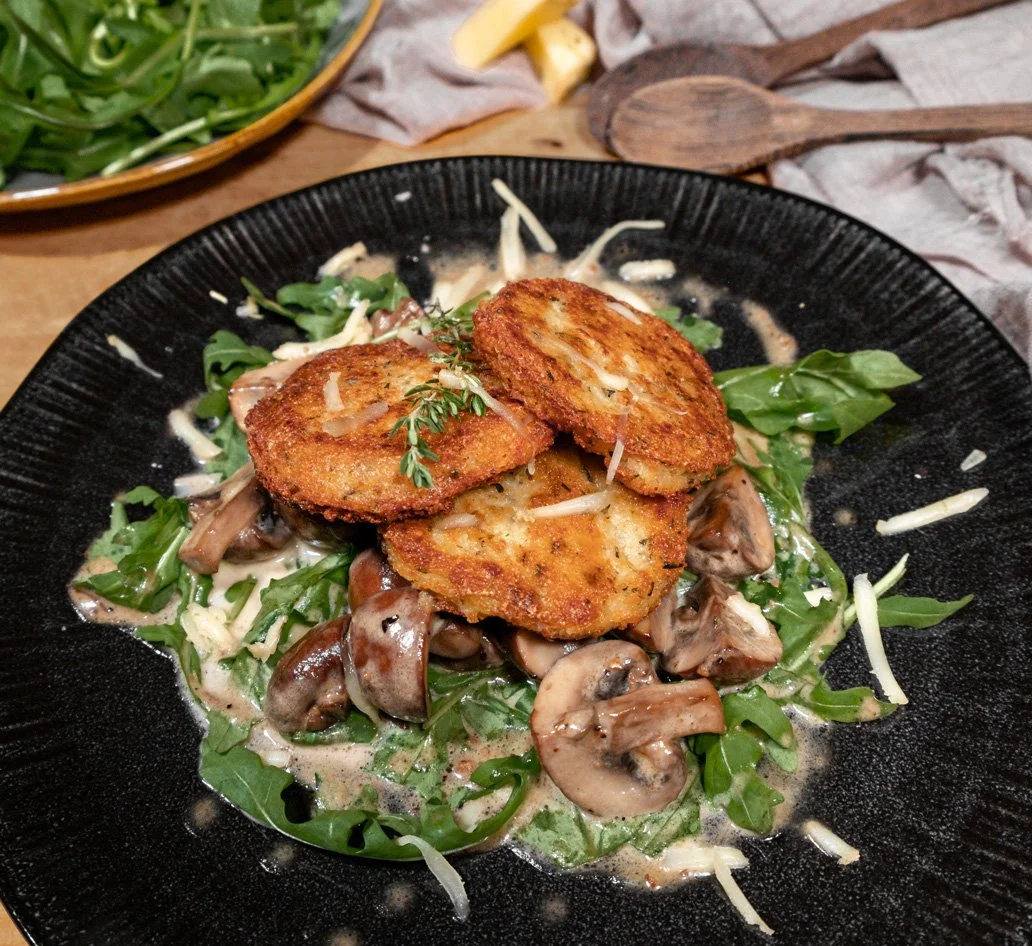 Rucola auf einen Teller geben, die Pilze und die Grießtaler darauf anrichten.