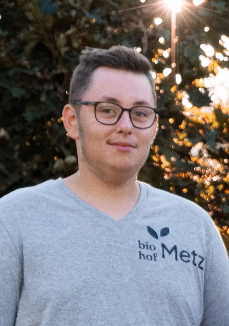 In seiner Ausbildung zum Landwirt hat Justin viel Erfahrung im biologischem Ackerbau und der Bio-Mastschweinehaltung erfahren.